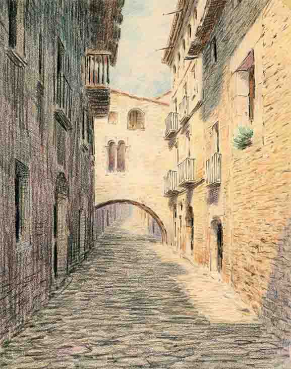 Observacions: Muntat sobre un altre paper de major mida, que està enganxat, a la vegada, a una cartolina marró més gran (42 x 31 cm). Segons la informació aportada per Leopoldo Gil Nebot, els dibuixos van ser realitzats pel seu oncle, l’arquitecte Francesc de P. Nebot, al període en què va estar amagat a conseqüència dels esdeveniments polítics entre els anys 1937 i 1938. La majoria dels paisatges són còpies, acolorides per invenció de l’autor, de les fotografies a b/n dels diferents volums de l’«Àlbum Meravella» (Llibreria Catalonia, Barcelona, 1927-1936), dedicats a les comarques pirinenques, a les catalanes i a Andorra.