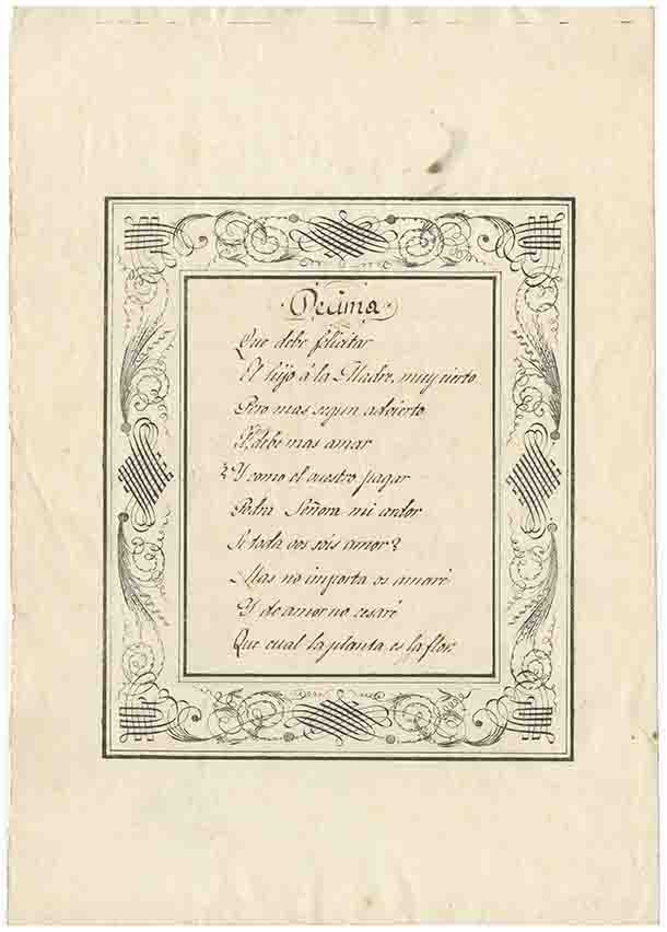 Observacions: Una dècima és una estrofa formada per deu versos octosíl·labs de rima consonant. La definició coincideix tant amb l’estructura del text com amb el seu títol. Del document destaca la sanefa que emmarca el contingut escrit a mà, perquè il·lustra els mateixos motius que en els diplomes emesos per l’Escola Josep Carreras, atorgats a Vicent Rodes [inv. 11070 G i 11071 G] i d’elaboració anònima. Aquest fet dona lloc a la hipòtesi que, potser, aquest sigui un dels treballs lliurats en aquesta escola. És un poema d’amor.