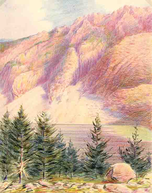 Observacions: Muntat sobre un altre paper de major mida. Es troba a dins d’una carpeta de paper amb el rètol, a tinta: “PIRINEO/(del Pº Gracia 76.)”. Segons la informació aportada per Leopoldo Gil Nebot, els dibuixos van ser realitzats pel seu oncle, l’arquitecte Francesc de P. Nebot, al període en què va estar amagat a conseqüència dels esdeveniments polítics entre els anys 1937 i 1938. La majoria dels paisatges són còpies, acolorides per invenció de l’autor, de les fotografies a b/n dels diferents volums de l’«Àlbum Meravella» (Llibreria Catalonia, Barcelona, 1927-1936), dedicats a les comarques pirinenques, a les catalanes i a Andorra.