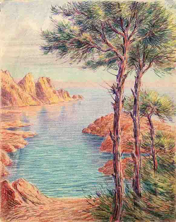 Observacions: Per la seva semblança amb el dibuix núm. d’inv. 5339 D hem considerat que aquest dibuix, que no en té cap inscripció, pot representar també l’estany de la Llosa. És el mateix cas dels dibuixos núm. d’inv. 5342 D i 5344 D. Muntat sobre un altre paper de major mida. Es troba a dins d’una carpeta de paper amb el rètol, a tinta: “PIRINEO/(del Pº Gracia 76.)”. Segons la informació aportada per Leopoldo Gil Nebot, els dibuixos van ser realitzats pel seu oncle, l’arquitecte Francesc de P. Nebot, al període en què va estar amagat a conseqüència dels esdeveniments polítics entre els anys 1937 i 1938. La majoria dels paisatges són còpies, acolorides per invenció de l’autor, de les fotografies a b/n dels diferents volums de l’«Àlbum Meravella» (Llibreria Catalonia, Barcelona, 1927-1936), dedicats a les comarques pirinenques, a les catalanes i a Andorra.