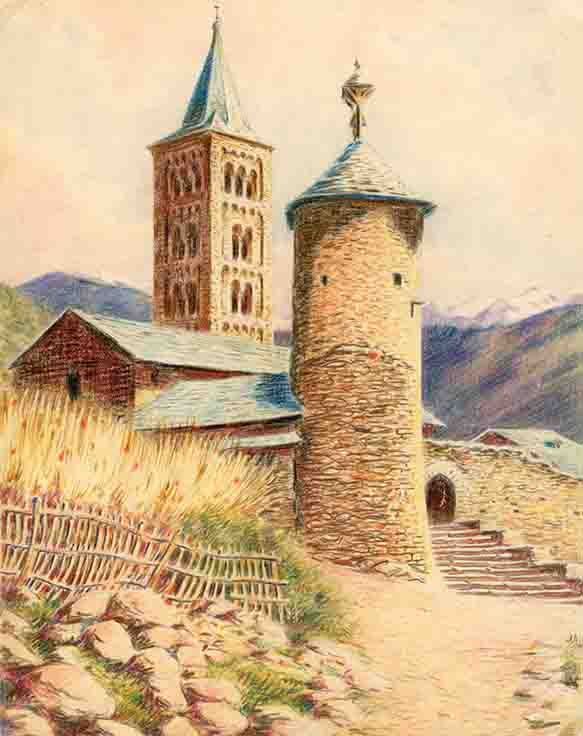 Observacions: Muntat sobre un altre paper de major mida, que està enganxat, a la vegada, a una cartolina marró més gran (42 x 31 cm). Segons la informació aportada per Leopoldo Gil Nebot, els dibuixos van ser realitzats pel seu oncle, l’arquitecte Francesc de P. Nebot, al període en què va estar amagat a conseqüència dels esdeveniments polítics entre els anys 1937 i 1938. La majoria dels paisatges són còpies, acolorides per invenció de l’autor, de les fotografies a b/n dels diferents volums de l’«Àlbum Meravella» (Llibreria Catalonia, Barcelona, 1927-1936), dedicats a les comarques pirinenques, a les catalanes i a Andorra. Al dors del dibuix núm. d’inv. 5277 D hi ha un esbós a llapis d’aquest dibuix.
