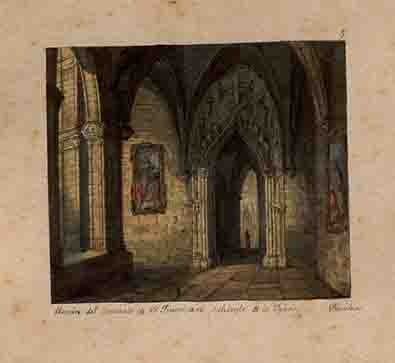 Inscripcions: «5» (a tinta, al damunt de l'ang. sup. dret del dibuix); «Claustro del convento de PP. Franciscanos saliendo de la Iglesia (Barcelona)» (a tinta, a sota del dibuix) (lletra petita).