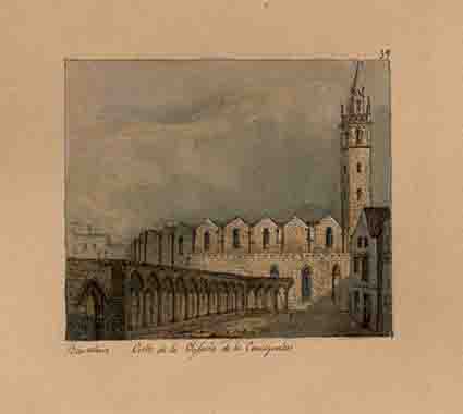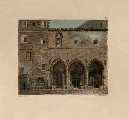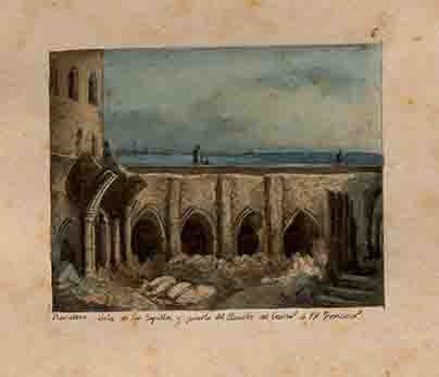 Inscripcions: «6» (a tinta, al damunt de l'ang. sup. dret del dibuix); «Barcelona vista de las Capillas i puerta del Claustro del Convenº de PP. Franciscºs» (a tinta, a sota del dibuix) (lletra petita).