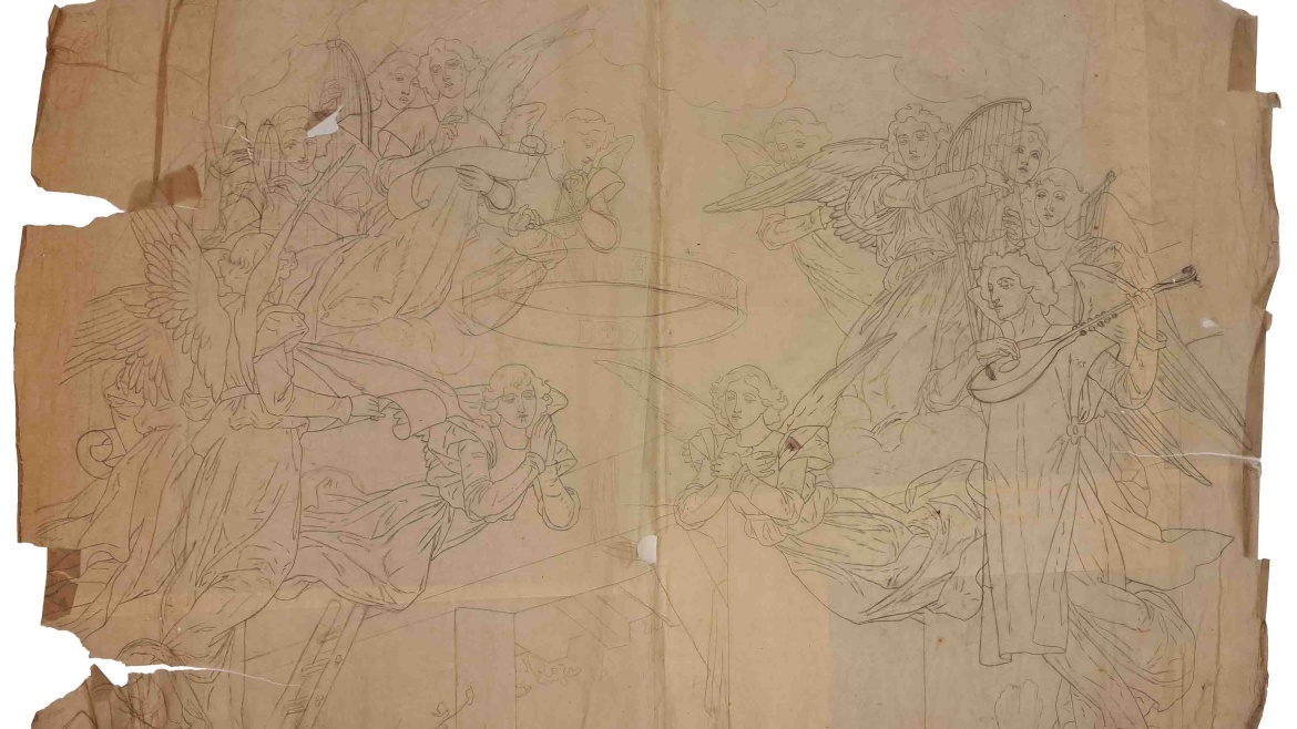 Inscripcions: «GLORIA EXCELSIS DEO» (a llapis, a un gran anell que hi ha al mig dels àngels).
