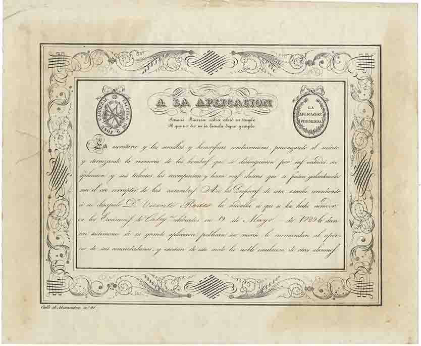 Inscripcions: Al segell de l’esquerra: «ESCUELA DE D. JOSE CARRERAS»; al de la dreta: «LA APLICACION PREMIADA». Al títol: «A LA APLICACIÓN | Jamás Minerva sábia abrió un templo | Al que no dió en la Escuela digno ejemplo.» El text, també gravat: «La escritura y las sencillas y honoríficas condecoraciones, preconizando el mérito | y eternizando la memoria de los hombres que se distinguieron por sus virtudes , su | aplicación y sus talentos , los recompensan y hacen mas ilustres que si fuesen galardonados | con el oro corruptor de las costumbres. Así los Profesores de esta escuela , concediendo | á su discípulo D,,n Vicente Rodes [escrit a mà amb tinta de color sèpia] la medalla á que se ha hecho acreedor en los Exámenes de Caligª [escrit a mà amb tinta de color sèpia] celebrados en 19 de Marzo de 1829 le dan | un testimonio de su grande aplicación ; publican su mérito , le recomiendan al apre- | cio de sus conciudadanos , y escitan de este modo la noble emulación de otros alumnos.» A sota de la cenefa decorativa: «Calle de Abaixadors n.º 21.». Al revers: «Dado en Barcelona a 1.º Oct.e 1830.» i les signatures de José i Carlos Carreras.