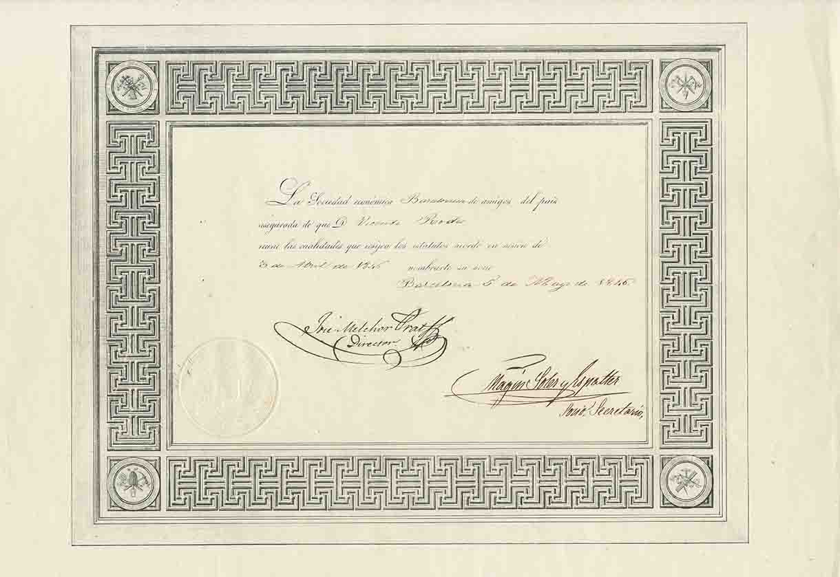Observacions: Títol de la Sociedad Económica Barcelonesa de Amigos del País lliurat a Vicent Rodes l’any 1846. Aquesta institució va començar la seva activitat el 1822. La seva tasca va ser important quant al progrés de la ciutat de Barcelona, ajudant al seu creixement econòmic a través de diferents programes i activitats que recolzaven el món de la cultura, la ciència i la indústria.