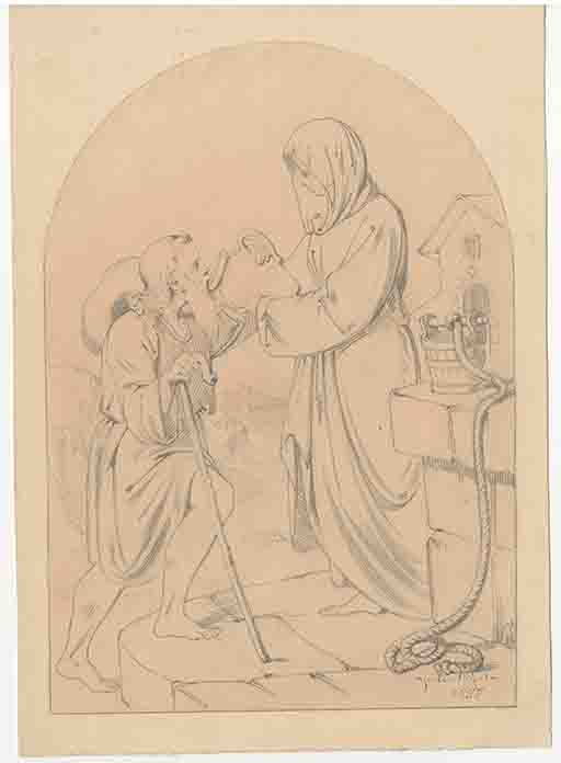 Observacions: En un primer moment es va pensar en l’assumpte de Rebeca i Eliécer, però no semblen personatges bíblics. Per això s’ha pensat en la possibilitat que sigui Santa Isabel d’Hongria.