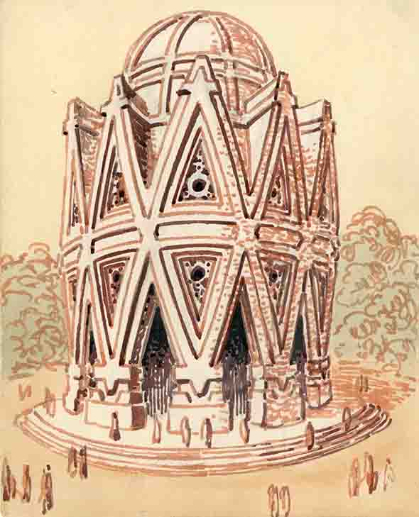 Observacions: Forma part d’una sèrie de dibuixos que representen arquitectures inventades què, segons la informació aportada per Leopoldo Gil Nebot, van ser realitzats -juntament amb una sèrie de paisatges, còpies de retrats i figures i altres apunts- pel seu oncle, l’arquitecte Francesc de P. Nebot, al període en què va estar amagat a conseqüència dels esdeveniments polítics entre els anys 1937 i 1938.