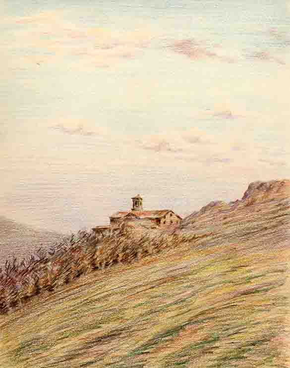 Observacions: Es troba a dins d’una carpeta de paper amb el rètol, a tinta i llapis blau i vermell: «Guillerias./24/(24 sin cartolina)». En lloc d’haver-hi 24 dibuixos, segons la inscripció de la carpeta, n’hi ha 11 (5366 D-5374 D; 7289 D-7290 D). Segons la informació aportada per Leopoldo Gil Nebot, els dibuixos van ser realitzats pel seu oncle, l’arquitecte Francesc de P. Nebot, al període en què va estar amagat a conseqüència dels esdeveniments polítics entre els anys 1937 i 1938. La majoria dels paisatges són còpies, acolorides per invenció de l’autor, de les fotografies a b/n dels diferents volums de l’«Àlbum Meravella» (Llibreria Catalonia, Barcelona, 1927-1936), dedicats a les comarques pirinenques, a les catalanes i a Andorra. És similar al dibuix núm. d’inv. 5353 D. Malgrat tot, aquestes dues composicions podrien ser inventades.