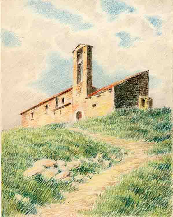 Observacions: Es troba a dins d’una carpeta de paper amb el rètol, a tinta i llapis blau i vermell: «Guillerias./24/(24 sin cartolina)». En lloc d’haver-hi 24 dibuixos, segons la inscripció de la carpeta, n’hi ha 11 (5366 D-5374 D; 7289 D-7290 D). Segons la informació aportada per Leopoldo Gil Nebot, els dibuixos van ser realitzats pel seu oncle, l’arquitecte Francesc de P. Nebot, al període en què va estar amagat a conseqüència dels esdeveniments polítics entre els anys 1937 i 1938. La majoria dels paisatges són còpies, acolorides per invenció de l’autor, de les fotografies a b/n dels diferents volums de l’«Àlbum Meravella» (Llibreria Catalonia, Barcelona, 1927-1936), dedicats a les comarques pirinenques, a les catalanes i a Andorra. És similar al dibuix núm. d’inv. 5353 D. Malgrat tot, aquestes dues composicions podrien ser inventades.