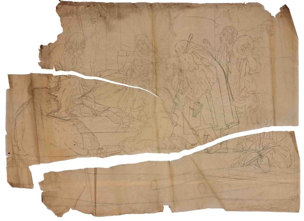 Observacions: Està dibuixat per les dues bandes del paper, que està trencat en dos fragments i presenta molts estrips. Els dibuixos 5698 D-5706 D són estudis sencers o parcials d’aquesta escena. La mateixa part de l’escena es representa al dibuix 5699 D; els dibuixos 5771 D-5773 D són estudis de la Mare de Déu amb el Nen d’aquesta composició, i el dibuix 5812 D representa detalls de diversos personatges. Forma part del conjunt de 758 dibuixos, principalment d’Enric Monserdà, que es conserven a l’Acadèmia procedents del llegat realitzat per la seva família l’any 1940. Es tracta d’apunts, esbossos i estergits- la major part de grans mides-, que Monserdà va realitzar per a les seves decoracions. També s’hi conserva un dibuix de Monserdà (inv. 2541 D) procedent del llegat Costa Simón. A la catalogació de l’any 1991 (Rafel Torrella) el present dibuix estava al rotllo 13, en el qual, juntament amb el rotllo 12, es reunien els dibuixos de les pintures de Sant Agustí Nou (5688 D-5705 D).