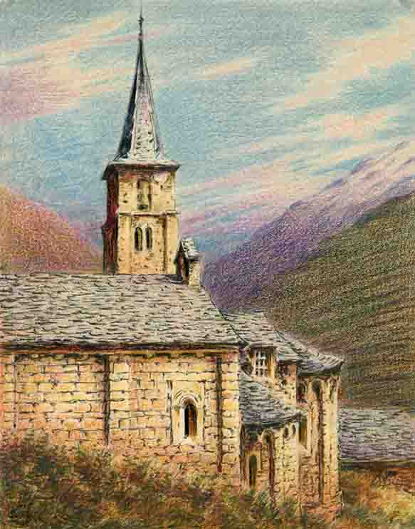 Observacions: Muntat sobre un altre paper de major mida, que està enganxat, a la vegada, a una cartolina marró més gran (42 x 31 cm). Segons la informació aportada per Leopoldo Gil Nebot, els dibuixos van ser realitzats pel seu oncle, l’arquitecte Francesc de P. Nebot, al període en què va estar amagat a conseqüència dels esdeveniments polítics entre els anys 1937 i 1938. La majoria dels paisatges són còpies, acolorides per invenció de l’autor, de les fotografies a b/n dels diferents volums de l’«Àlbum Meravella» (Llibreria Catalonia, Barcelona, 1927-1936), dedicats a les comarques pirinenques, a les catalanes i a Andorra. Al dibuix núm. d’inv. 5329 D es representa també aquesta església.
