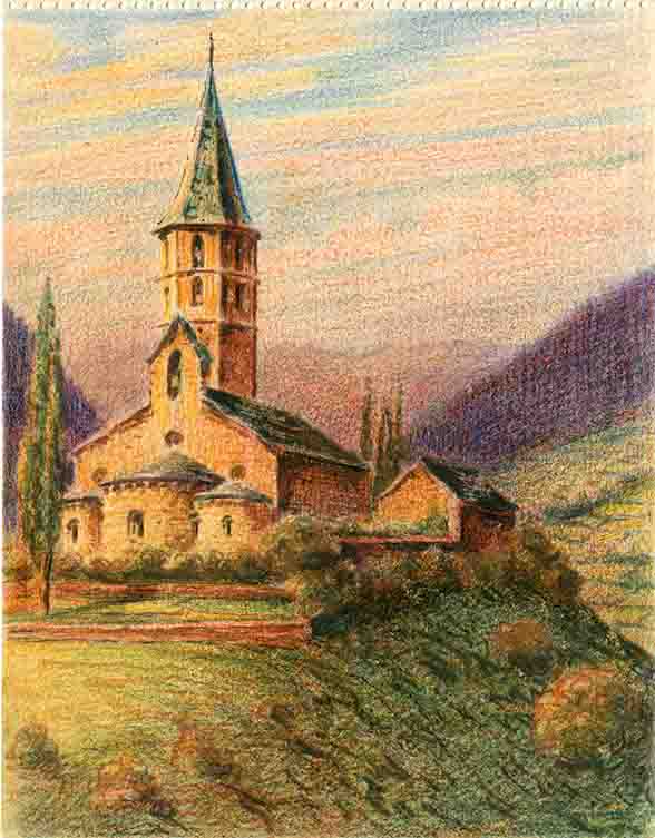 Observacions: Es troba a dins d’una carpeta de paper amb el rètol, a tinta negra: «Arán/-6-/» i a llapis «docena y 1/2 / 18. En lloc d’haver-hi 6 o 18 dibuixos, segons la inscripció de la carpeta, n’hi ha 7 (5375 D-5381 D). Segons la informació aportada per Leopoldo Gil Nebot, els dibuixos van ser realitzats pel seu oncle, l’arquitecte Francesc de P. Nebot, al període en què va estar amagat a conseqüència dels esdeveniments polítics entre els anys 1937 i 1938. La majoria dels paisatges són còpies, acolorides per invenció de l’autor, de les fotografies a b/n dels diferents volums de l’«Àlbum Meravella» (Llibreria Catalonia, Barcelona, 1927-1936), dedicats a les comarques pirinenques, a les catalanes i a Andorra. És similar al dibuix núm. d’inv. 5353 D. Malgrat tot, aquestes dues composicions podrien ser inventades.