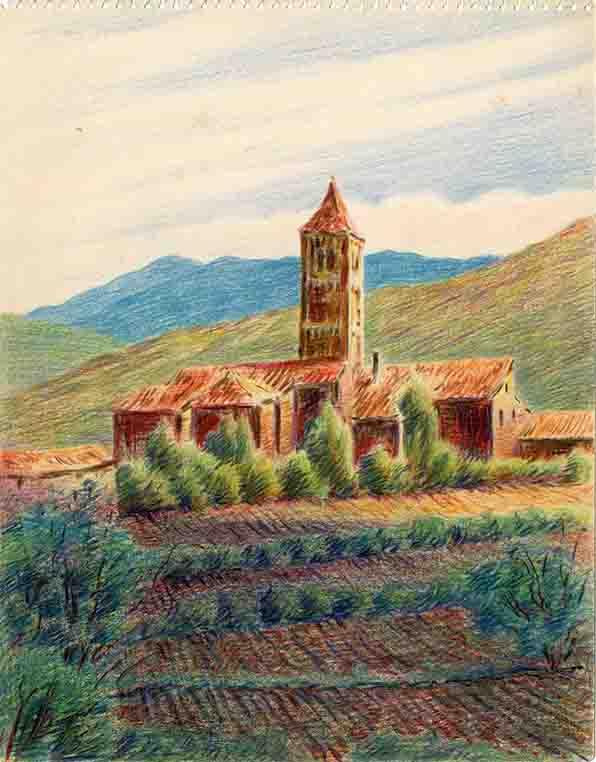 Observacions: Es troba a dins d’una carpeta de paper amb el rètol, a tinta i llapis blau i vermell: «Guillerias./24/(24 sin cartolina)». En lloc d’haver-hi 24 dibuixos, segons la inscripció de la carpeta, n’hi ha 11 (5366 D-5374 D; 7289 D-7290 D). Segons la informació aportada per Leopoldo Gil Nebot, els dibuixos van ser realitzats pel seu oncle, l’arquitecte Francesc de P. Nebot, al període en què va estar amagat a conseqüència dels esdeveniments polítics entre els anys 1937 i 1938. La majoria dels paisatges són còpies, acolorides per invenció de l’autor, de les fotografies a b/n dels diferents volums de l’«Àlbum Meravella» (Llibreria Catalonia, Barcelona, 1927-1936), dedicats a les comarques pirinenques, a les catalanes i a Andorra. És similar al dibuix núm. d’inv. 5353 D. Malgrat tot, aquestes dues composicions podrien ser inventades.