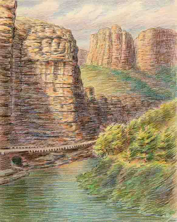 Observacions: Muntat sobre un altre paper de major mida. Es troba a dins d’una carpeta de paper amb el rètol, a tinta: «PIRINEO/(del Pº Gracia 76.)». Segons la informació aportada per Leopoldo Gil Nebot, els dibuixos van ser realitzats pel seu oncle, l’arquitecte Francesc de P. Nebot, al període en què va estar amagat a conseqüència dels esdeveniments polítics entre els anys 1937 i 1938. La majoria dels paisatges són còpies, acolorides per invenció de l’autor, de les fotografies a b/n dels diferents volums de l’«Àlbum Meravella» (Llibreria Catalonia, Barcelona, 1927-1936), dedicats a les comarques pirinenques, a les catalanes i a Andorra.