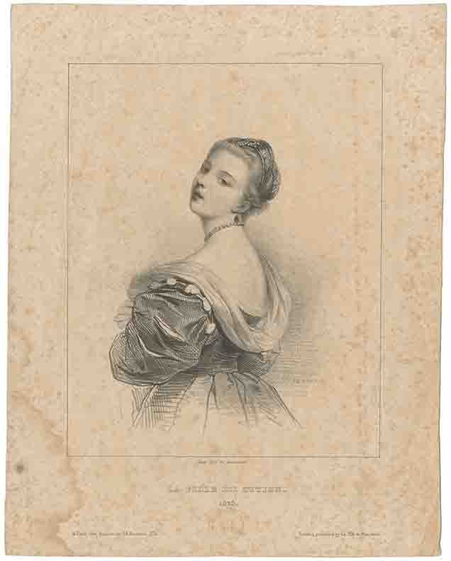 Inscripcions: Sota el marc del dibuix, imprès al centre: «Imp. Lith. De Lemercier» | «LA FILLE DE TITIEN.» | «1525.». Sota l’any, s’aprecia un segell en relleu amb les inicials «A C».
