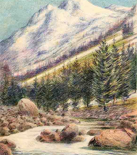 Inventari general: 5378 D Inscripcions: "Valle de Bohí- paysage" (a llapis, al dors); "El Ribagorza. (subratllat)/Valle de Bohí- Paysage" (a tinta, al dors). Procedència: Forma part d'un conjunt de 153 dibuixos realitzats per Francesc de P. Nebot, lliurats a l'Acadèmia, com a dipòsit, per Leopoldo…