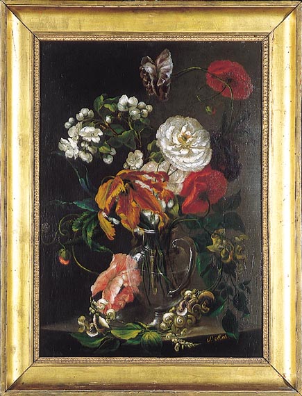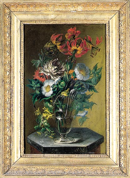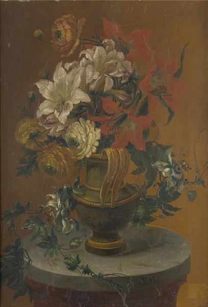 Inscripcions: Al dors, en etiqueta Acadèmia amb tinta: “N.a. 316/ N.M. 118/ Flores/ Por Molet” i etiqueta exposició Madrid, “El bodegón español...". Signatura: “S.M.” (part inf. dreta). Procedència: Probablement es tracta d’una de les obres que Molet va anar lliurant a l’escola anualment al llarg dels anys…