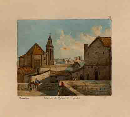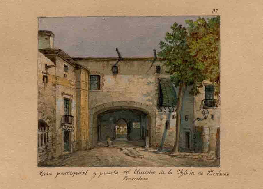 Inscripcions: «37» (a tinta, al damunt de l'ang. sup. dret del dibuix); «Casa parroquial y puerta del Claustro de la Iglesia de Sª Anna/Barcelona» (a tinta, a sota del dibuix) (lletra petita).