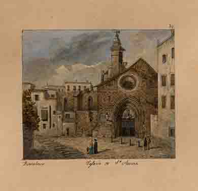 Inscripcions: «34» (a tinta, al damunt de l'ang. sup. dret del dibuix); «Barcelona» (a tinta, a sota de la part esq. del dibuix); «Iglesia de Sª Anna» (a tinta, a sota de la part central del dibuix) (lletra petita).