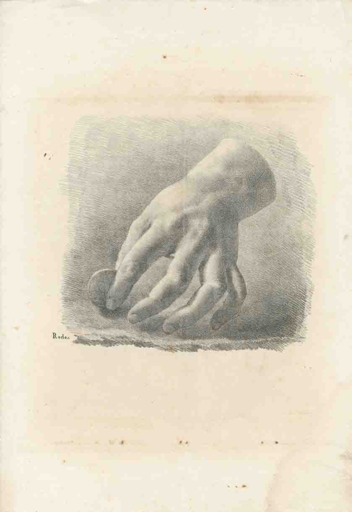 Observacions: (a) Representa l’estudi d’una mà sostenint un objecte de forma esfèrica que sembla una moneda. Pot ser un model copiat directament d’un guix o de les anomenades cartilles de principis o de dibuix. Aquests tipus de representacions anatòmiques, sorgides al voltant del segle XVII, són comunes com a material pedagògic per a la formació dels artistes. Hi ha diverses litografies de Vicent Rodes on l’artista il·lustra mans, caps, boques, nassos, etc. Durant la seva etapa de professor a l’Escola Nobles Arts (1834-1858), li van encarregar la tasca d’elaborar de nou els models de dibuix de l’Escola, feina que va fer mitjançant estampes litogràfiques. Aquests exemplars van ser molt útils als ensenyaments de Llotja durant anys. (b) Al revers del paper hi ha un dibuix fet amb llapis de grafit que representa formes esfèriques, lineals i espirals.