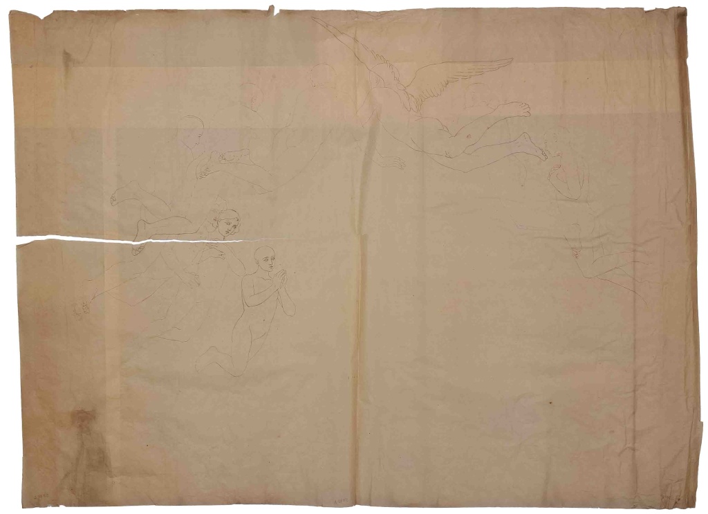 Observacions: El paper està tallat pel mig. Se sembla molt als àngels de l’Ascensió de l’església de Sant Agustí Nou i de la masia de Sobrevia, encara que hi ha diferències. La pintura de Sant Agustí va desaparèixer en un incendi. Elías 1927 la reprodueix (làm. V), però no menciona la pintura de la masia de Sobrevia, que sí que es conserva i és idèntica. Els dibuixos 5688 D-5697 D, 5721 b D, 5835 D i 5840 D-5842 D presenten apunts i fragments que probablement serviren per a la composició. Dibuixos per a les pintures de Sant Agustí Nou, en la catalogació de 1991 hi havia al rotllo 12 i al 13 (5688 D-5705 D). Forma part del conjunt de 758 dibuixos, principalment d’Enric Monserdà, que es conserven a l’Acadèmia procedents del llegat realitzat per la seva família l’any 1940. Es tracta d’apunts, esbossos i estergits- la major part de grans mides-, que Monserdà va realitzar per a les seves decoracions. També s’hi conserva un dibuix de Monserdà (inv. 2541 D) procedent del llegat Costa Simón. A la catalogació de l’any 1991 (Rafel Torrella) aquest dibuix formava part del rotllo 33 dedicat a dibuixos d’àngels (5840 D-5849 D).