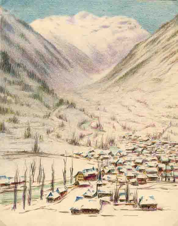 Observacions: Muntat sobre un altre paper de major mida, que està enganxat, a la vegada, a una cartolina marró més gran (42 x 31 cm). Segons la informació aportada per Leopoldo Gil Nebot, els dibuixos van ser realitzats pel seu oncle, l’arquitecte Francesc de P. Nebot, al període en què va estar amagat a conseqüència dels esdeveniments polítics entre els anys 1937 i 1938. La majoria dels paisatges són còpies, acolorides per invenció de l’autor, de les fotografies a b/n dels diferents volums de l’«Àlbum Meravella» (Llibreria Catalonia, Barcelona, 1927-1936), dedicats a les comarques pirinenques, a les catalanes i a Andorra. Al dors del dibuix núm. d’inv. 5277 D hi ha un esbós a llapis d’aquest dibuix. Aquest dibuix en concret es basa en una fotografia de la pàgina 21 del volum II (1929).