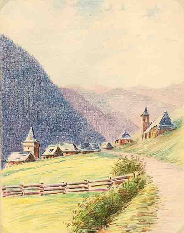Observacions: Muntat sobre un altre paper de major mida, que està enganxat, a la vegada, a una cartolina marró més gran (42 x 31 cm). Segons la informació aportada per Leopoldo Gil Nebot, els dibuixos van ser realitzats pel seu oncle, l’arquitecte Francesc de P. Nebot, al període en què va estar amagat a conseqüència dels esdeveniments polítics entre els anys 1937 i 1938. La majoria dels paisatges són còpies, acolorides per invenció de l’autor, de les fotografies a b/n dels diferents volums de l’«Àlbum Meravella» (Llibreria Catalonia, Barcelona, 1927-1936), dedicats a les comarques pirinenques, a les catalanes i a Andorra. Al dors del dibuix núm. d’inv. 5277 D hi ha un esbós a llapis d’aquest dibuix.