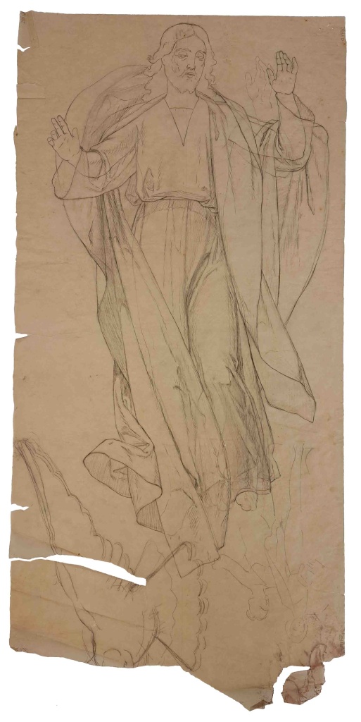 Observacions: El dibuix està dibuixat per les dues bandes. La pintura de Sant Agustí, que desaparegué en un incendi, presenta diferències amb el dibuix; Elías 1927 la reprodueix (làm. V), però no menciona la pintura de la masia de Sobrevia, que sí es conserva i és idèntica. Els dibuixos 5688 D-5697 D, 5721 b D, 5835 D i 5840 D-5842 D presenten apunts i fragments que probablement serviren per a la composició. Forma part del conjunt de 758 dibuixos, principalment d’Enric Monserdà, que es conserven a l’Acadèmia procedents del llegat realitzat per la seva família l’any 1940. Es tracta d’apunts, esbossos i estergits- la major part de grans mides-, que Monserdà va realitzar per a les seves decoracions. També s’hi conserva un dibuix de Monserdà (inv. 2541 D) procedent del llegat Costa Simón. A la catalogació de l’any 1991 (Rafel Torrella) el present dibuix estava al rotllo 12, en el qual, juntament amb el rotllo 13, es reunien els dibuixos de les pintures de Sant Agustí Nou (5688 D-5705 D).