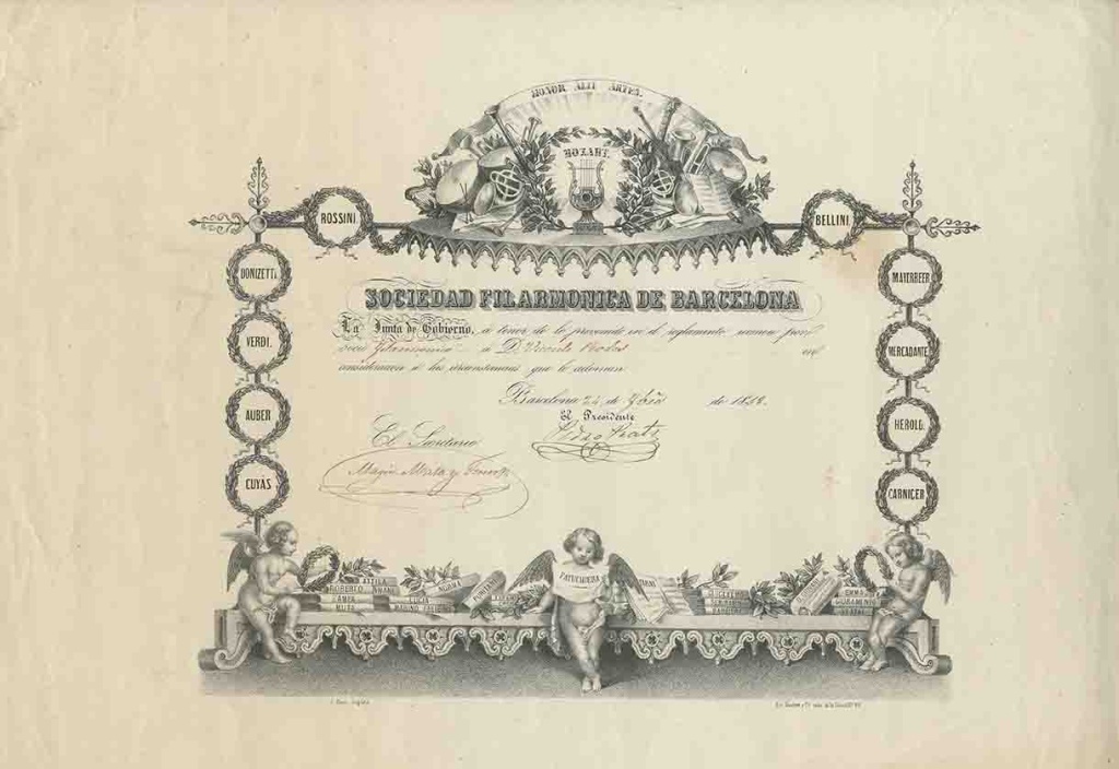 Observacions: És el diploma d’ingrés de Vicent Rodes a la Societat Filharmònica de Barcelona (1848). Aquesta institució va ser creada l’any 1844 i tenia la funció de ser promotora de concerts amb finalitat pedagògica. Gràcies a aquesta societat es van produir, a la ciutat de Barcelona, recitals d’artistes importants com ara Franz Liszt, entre d’altres. Al diploma destaquen els noms de diferents músics i compositors destacats de la història; també llegim un conjunt de noms situats a la part baixa, que fan referència a diverses òperes i composicions musicals, moltes realitzades pels compositors que trobem esmentats als laterals.