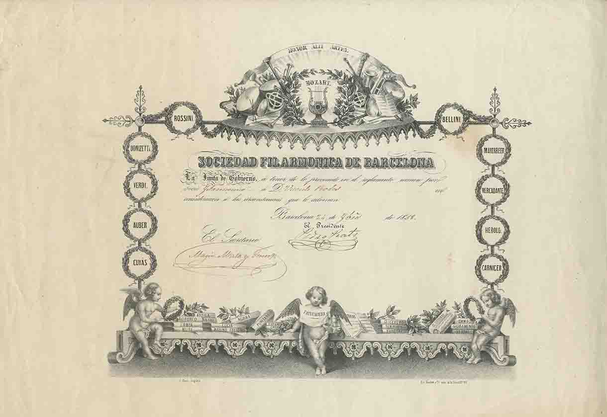 Inscripcions: Algunes gravades a la planxa, d’altres escrites a mà: «HONOR ALIT ARTES. | MOZART. | SOCIEDAD FILARMONICA DE BARCELONA | «La Junta de Gobierno, á tenor de lo prevenido en el reglamento reconoce por socio filarmonico [escrit amb tinta de color sèpia] á D. Vicente Rodes [escrit amb tinta de color sèpia] en consideración á las circumstancias que le adornan [gravat a la planxa] | Barcelona 24 [escrit amb tinta sèpia] de febrero [escrit amb tinta de color sèpia] de 1848 [escrit amb tinta de color sèpia] [text gravat a la planxa] | El Presidente | Pedro Prats [signatura amb tinta de color sèpia] | El Secretario | Magín Mata y Ferrer [signatura amb tinta de color sèpia]». A mode de marc, gravat al voltant del text central a la banda esquerra: «ROSSINI. | DONZETTI. | VERDI. | AUBER | CUYÁS». Al marge inferior, gravat a la planxa: «ROBERTO | ZAMPA| MUTA | ATTILA | LUCIA | MARINO FALIERO | NORMA | PIURITANI | FUFEMIA | GRE [?] | FATUCHIERA | TABAT | GUIGLELMO | SEMIRAMIS | BARBIERE | D. GIONAVI | EMMA | GIURAMENTO | VESTAL» | «L. Gurri litografió | Lit. Gardell y C.ª calle de la Unión N.º 26.». Al marge lateral dret, gravat a la planxa: «BELLINI. | MAYENBEER | MERCADANTE | HEROLD. | CARNICER».