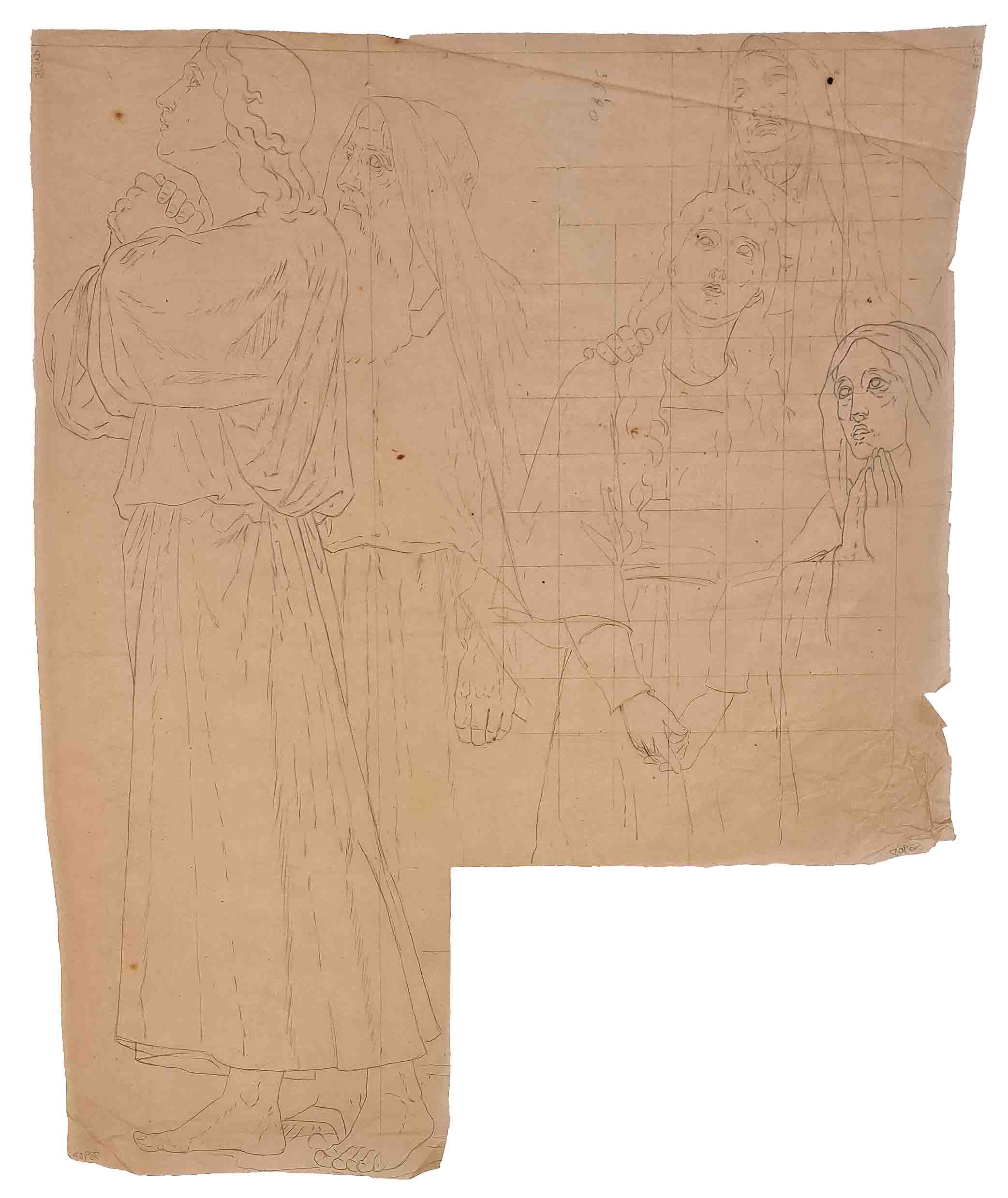 Observacions: El dibuix està dibuixat per les dues bandes i quadriculat a llapis. Els personatges no coincideixen amb els de la pintura final. La pintura de Sant Agustí, que desaparegué en un incendi, presenta diferències amb el dibuix; Elías 1927 la reprodueix (làm. V), però no menciona la pintura de la masia de Sobrevia, que sí es conserva i és idèntica. Els dibuixos 5688 D-5697 D, 5721 b D, 5835 D i 5840 D-5842 D presenten apunts i fragments que probablement serviren per a la composició. Forma part del conjunt de 758 dibuixos, principalment d’Enric Monserdà, que es conserven a l’Acadèmia procedents del llegat realitzat per la seva família l’any 1940. Es tracta d’apunts, esbossos i estergits- la major part de grans mides-, que Monserdà va realitzar per a les seves decoracions. També s’hi conserva un dibuix de Monserdà (inv. 2541 D) procedent del llegat Costa Simón. A la catalogació de l’any 1991 (Rafel Torrella) el present dibuix estava al rotllo 12, en el qual, juntament amb el rotllo 13, es reunien els dibuixos de les pintures de Sant Agustí Nou (5688 D-5705 D).