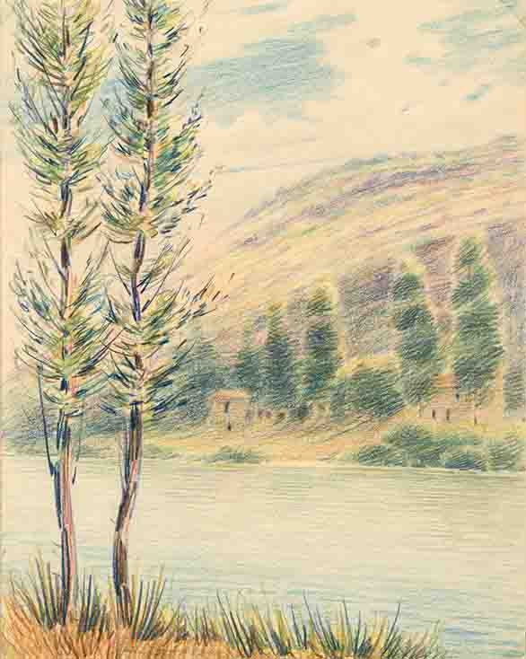 Observacions: Muntat sobre un altre paper de major mida, que està enganxat, a la vegada, a una cartolina marró més gran (42 x 31 cm). Segons la informació aportada per Leopoldo Gil Nebot, els dibuixos van ser realitzats pel seu oncle, l’arquitecte Francesc de P. Nebot, al període en què va estar amagat a conseqüència dels esdeveniments polítics entre els anys 1937 i 1938. La majoria dels paisatges són còpies, acolorides per invenció de l’autor, de les fotografies a b/n dels diferents volums de l’«Àlbum Meravella» (Llibreria Catalonia, Barcelona, 1927-1936), dedicats a les comarques pirinenques, a les catalanes i a Andorra.