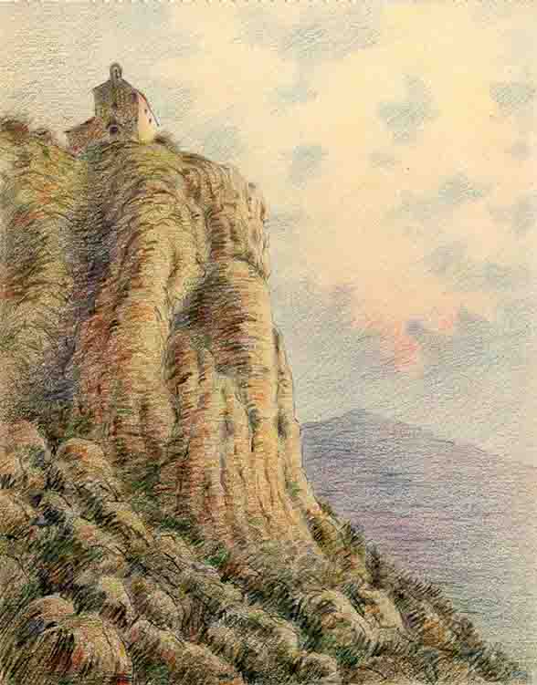Observacions: Es troba a dins d’una carpeta de paper amb el rètol, a tinta i llapis blau i vermell: “Guillerias./24/(24 sin cartolina)”. Enlloc d’haver-hi 24 dibuixos, segons la inscripció de la carpeta, n’hi ha 11 (5366 D-5374 D; 7289 D-7290 D). Segons la informació aportada per Leopoldo Gil Nebot, els dibuixos van ser realitzats pel seu oncle, l’arquitecte Francesc de P. Nebot, al període en què va estar amagat a conseqüència dels esdeveniments polítics entre els anys 1937 i 1938. La majoria dels paisatges són còpies, acolorides per invenció de l’autor, de les fotografies a b/n dels diferents volums de l’«Àlbum Meravella» (Llibreria Catalonia, Barcelona, 1927-1936), dedicats a les comarques pirinenques, a les catalanes i a Andorra. És similar al dibuix núm. d’inv. 5353 D. Malgrat tot, aquestes dues composicions podrien ser inventades.