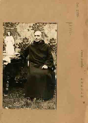 Observacions/ descripció / història-context: Fotografia enganxada parcialment a un paper suport de major grandària de color ocre, probablement la figura correspon a un monjo benedictí.