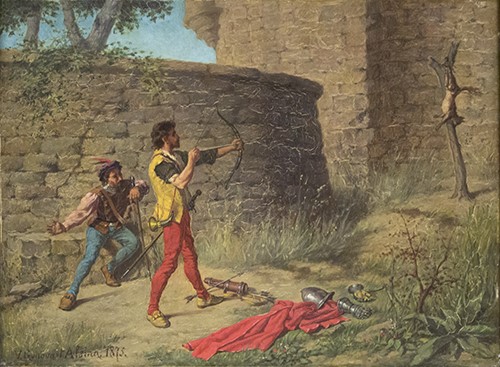 Observacions: A l’Acadèmia hi ha, entre els papers del llegat, una fotografia de l’obra, que porta escrit al dors: “”L’Ensaig de Ballesta”/ segle XV/ pintat en 1875 per/ Vicens Genovart Alsina”.