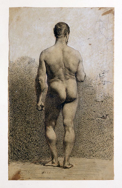 Al febrer de 1862 Fortuny, pensionat a Roma per la Diputació va enviar a l’Acadèmia la cópia d’un oli de Felice Ficherelli (núm d’inv. 309) i vint dibuixos d’acadèmia datats entre el 1859 i el 1861, entre els quals es troba aquesta peça. Fortuny va dedicar bona part del seu temps com a pensionat a la còpia de models masculins del natural, de peces pictòriques importants així com d’exemples de l’estatuària clàssica. Aquest sistema d’aprenentatge era l’habitual a l’època, encara que la qualitat que s’observa als dibuixos de Fortuny es pot considerar veritablement extraordinària per tractar-se del treball d’un estudiant.