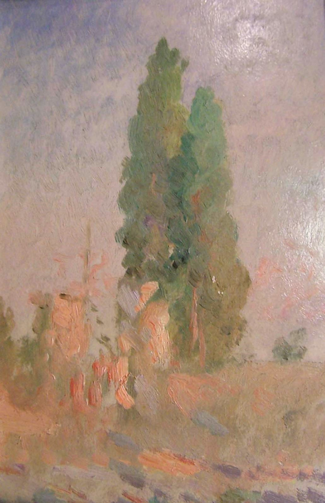 Observacions: És un dels 9 petits paisatges que, emmarcats junts, conformen la composició “Voltants de Barcelona” (núms. d’inv. 872-880), una de les dues pintures amb les quals l’autor guanyà la medalla d’or del concurs de paisatge Josep Masriera de l’any 1921, passant a formar part de la col•lecció de l’Acadèmia, entitat organitzadora d’aquest concurs anual. L’altra composició guanyadora, també propietat de l’Acadèmia, és la formada pels paisatges núms. d’inv. 863-871.