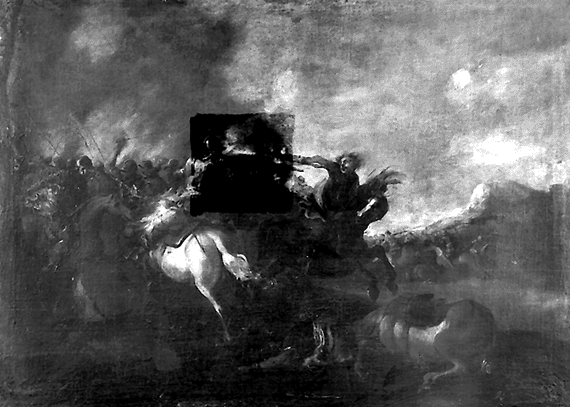 Restauracions: aquest quadre podria ser el que representa una Batalla (se’n conserven 4 a la col•lecció) que el 1863 netejà i folrà Miguel Aragon, i un dels dos del mateix tema, els marcs dels quals van ser intervinguts per L. M. Lagarde (a un el posa un marc nou i daurat i a l’altre el va redorar el marc).