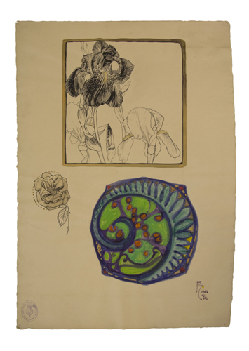 Observacions: amb els dibuixos núm. d’inv. 1481 D-1486 D l’autor va guanyar la Borsa de viatge per Composició decorativa en pintura del curs 1913-1914. Aquest dibuix és un esbós del núm. d’inv. 1482 D. FERMÍN TUBAU PUJOL (Secció Tècnica Escola d’Arts i Oficis i Belles Arts: Borsa de viatge i estudi per Composició decorativa-pintura). Fou l’únic opositor (2.4.1914). Hi ha un escrit de l’autor amb al•legacions per poder participar-hi, ja que en principi no l’havien admès (253.5.1.12.1). Els exercicis eren: “1º Estudios de flora, en cuatro días de 9 a 13 (núms. d’inv. 1483 D i 1485 D?). 2º Estudios de fauna, en un día, de 15 a 18 (núms. d’inv. 1484 D i 1486 D?).. 3º Ejecutar una composición, en un día. 4º Desarrollo de la composición o de un fragmento de la misma” (253.5.1.12.6). El tema escollit per a la composició fou “Projecte d’enquadernació de un Nobiliari Català” (253.5.1.16) (núms. inv. 1481 i 1482 D). Li concedeixen la Borsa de 2.000 pessetes el juny de 1914 per estudiar durant sis mesos a l’estranger, especialment a París, Brussel•les i Munich. Havia de presentar després a l’Acadèmia una obra original i els treballs realitzats durant la pensió, dels quals l’Acadèmia podria guardar-se els que volgués (253.5.1.4). En l’escrit de sol•licitud de l’artista (27 de febrer de 1914, diu tenir 22 anys i ser natural de Barcelona) consten les assignatures, anys i notes obtingudes (253.5.1.15).