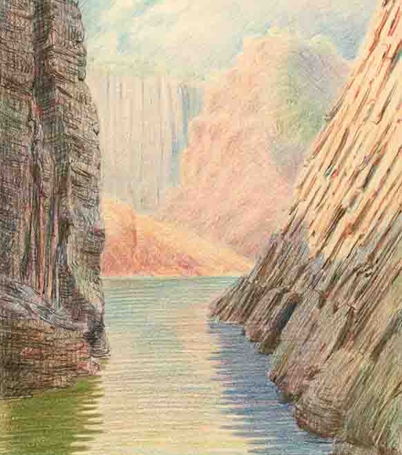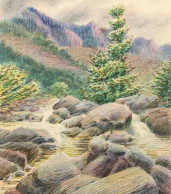 Inscripcions: "Cascada de l'estany de Caballers." (a llapis, al dors); "Ribagorza/Cascada del estanque de Caballers" (a tinta, al dors); al dors del paper suport, a tinta: "Ribagorza" (inscripció tallada).