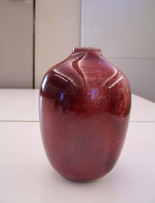 Tècnica d'esmalt de coure. Peça cuita a 1300º, amb una mala combustió per obtenir el Roig de coure o “sang de bou”.
