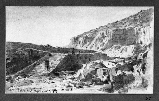 Inscripcions: “Falda de Monjui. Nbre. 1874” (a tinta, a la part inf. esq.).