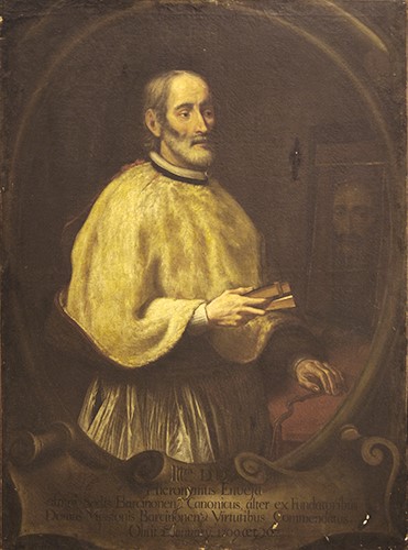 Inscripcions: A la part inferior (en una cartel.la pintada): “Iltris D.D./ Hieronimus Enveja/ almae Sedis Barcinonen. Canonicus, alter ex Fundatoribus/ Domus Missionis Barcinonen. Virtutibus Commendatus/"Obiit 2 January: 1709. aet. 67.”